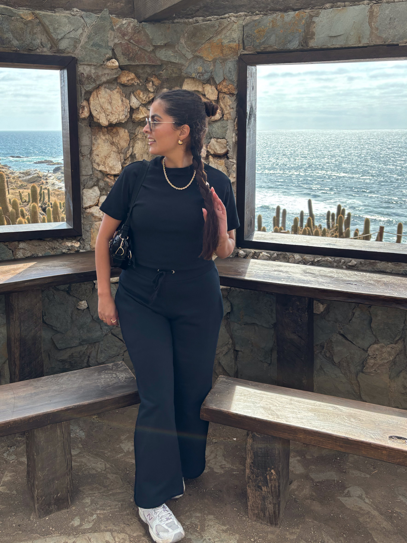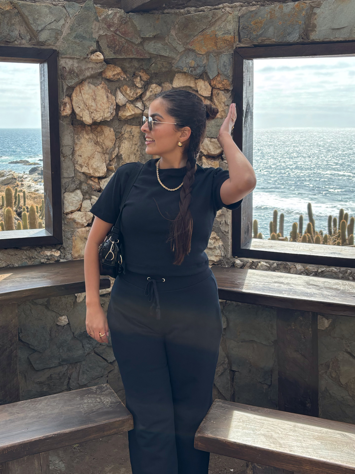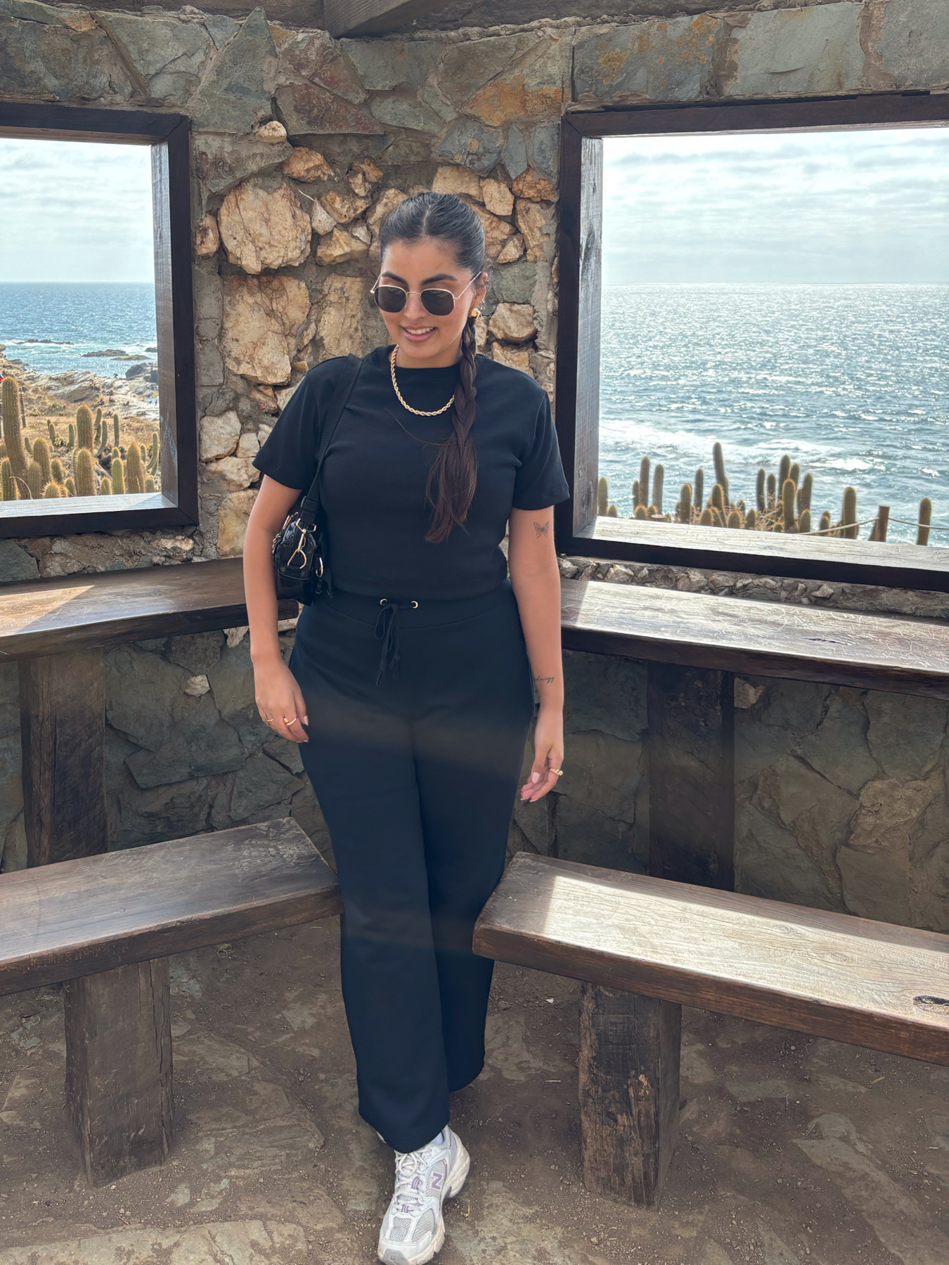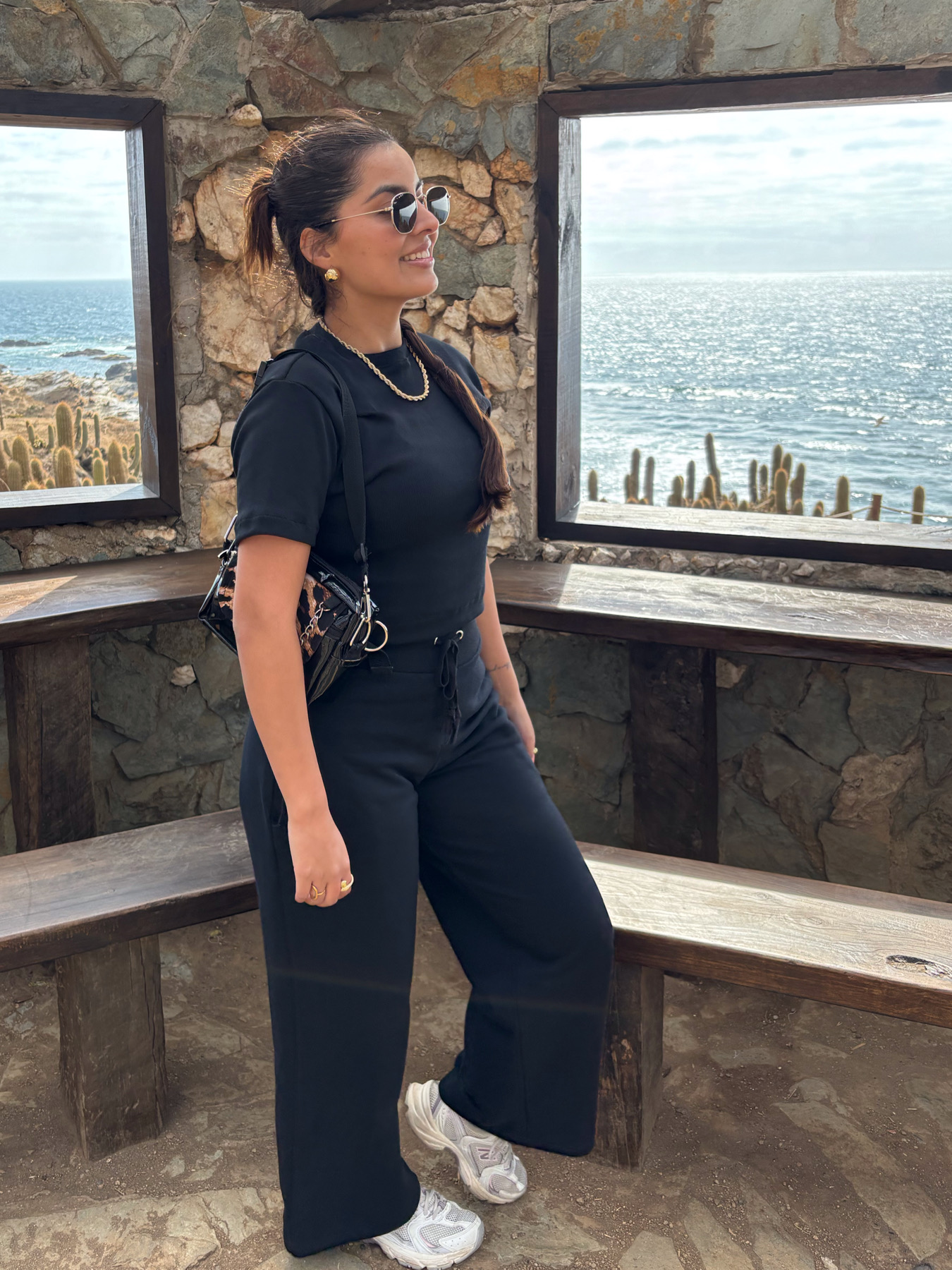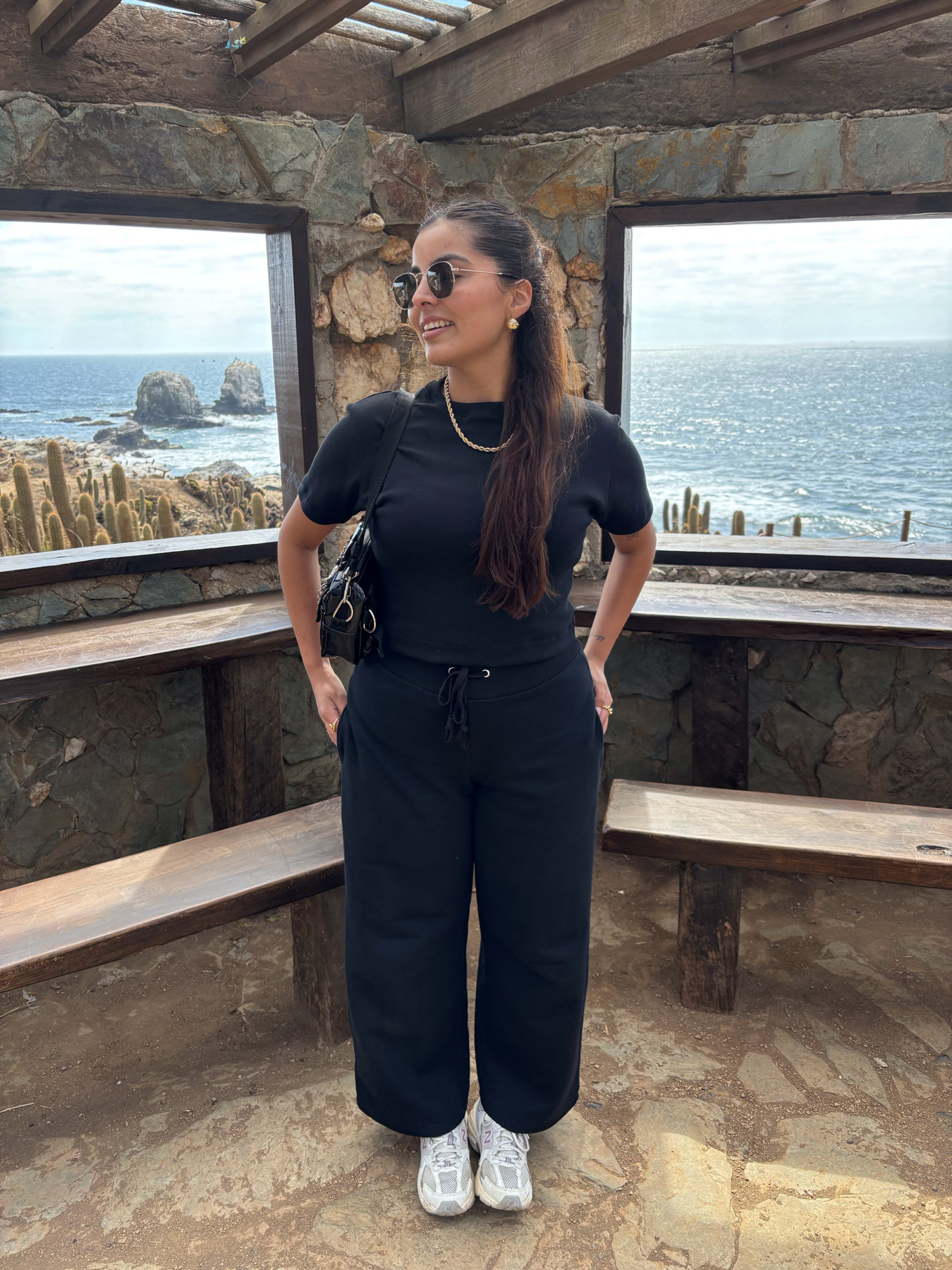 Es importante considerar que las medidas son referenciales y pueden tener pequeñas variaciones producto de la confección y corte manual. La modelo de las fotos tiene de busto una medida de 95 cm y de cadera 105 cm, y esta usando la talla XS/S en la polera y la talla L en el pantalón palazzo.