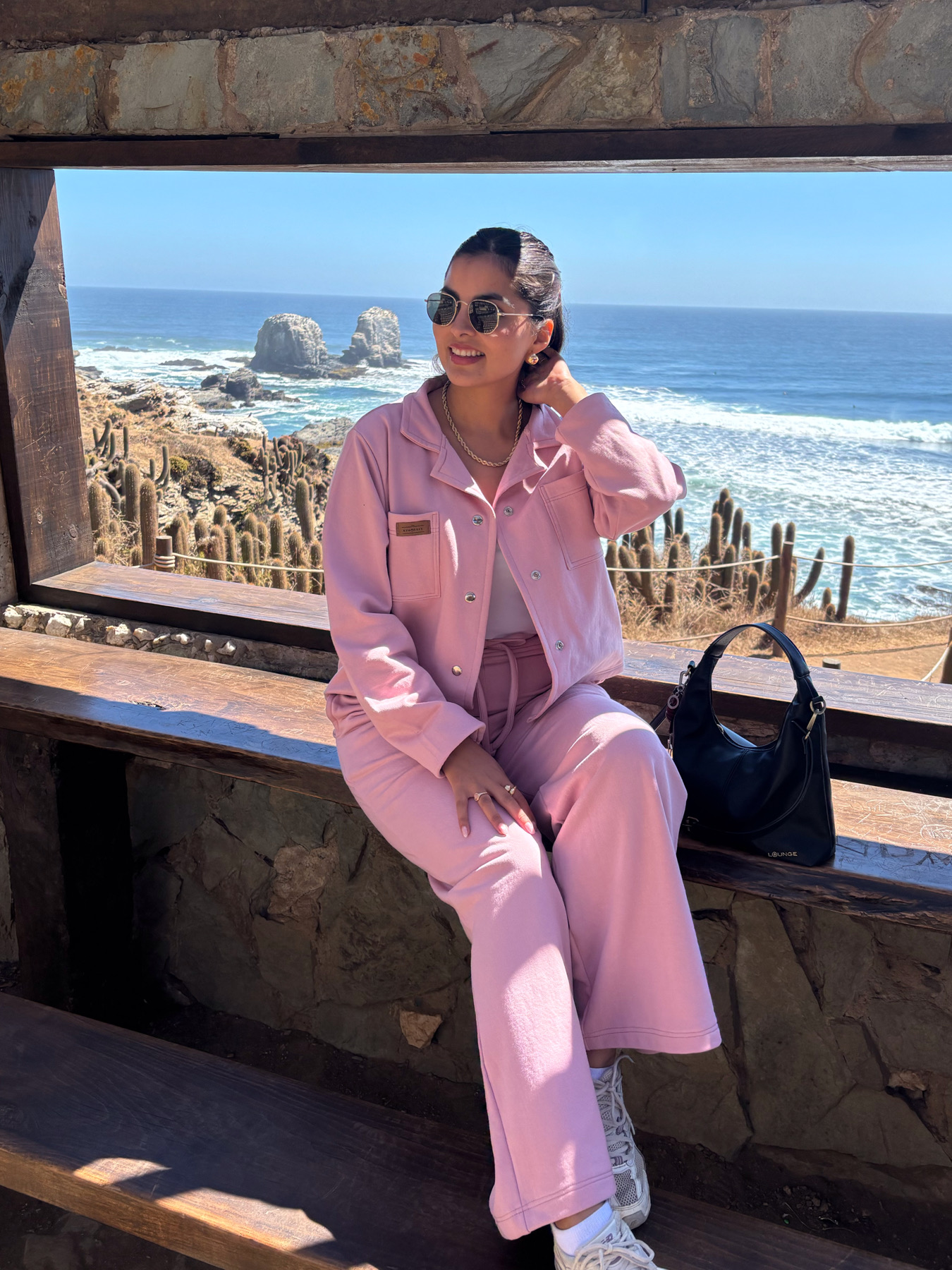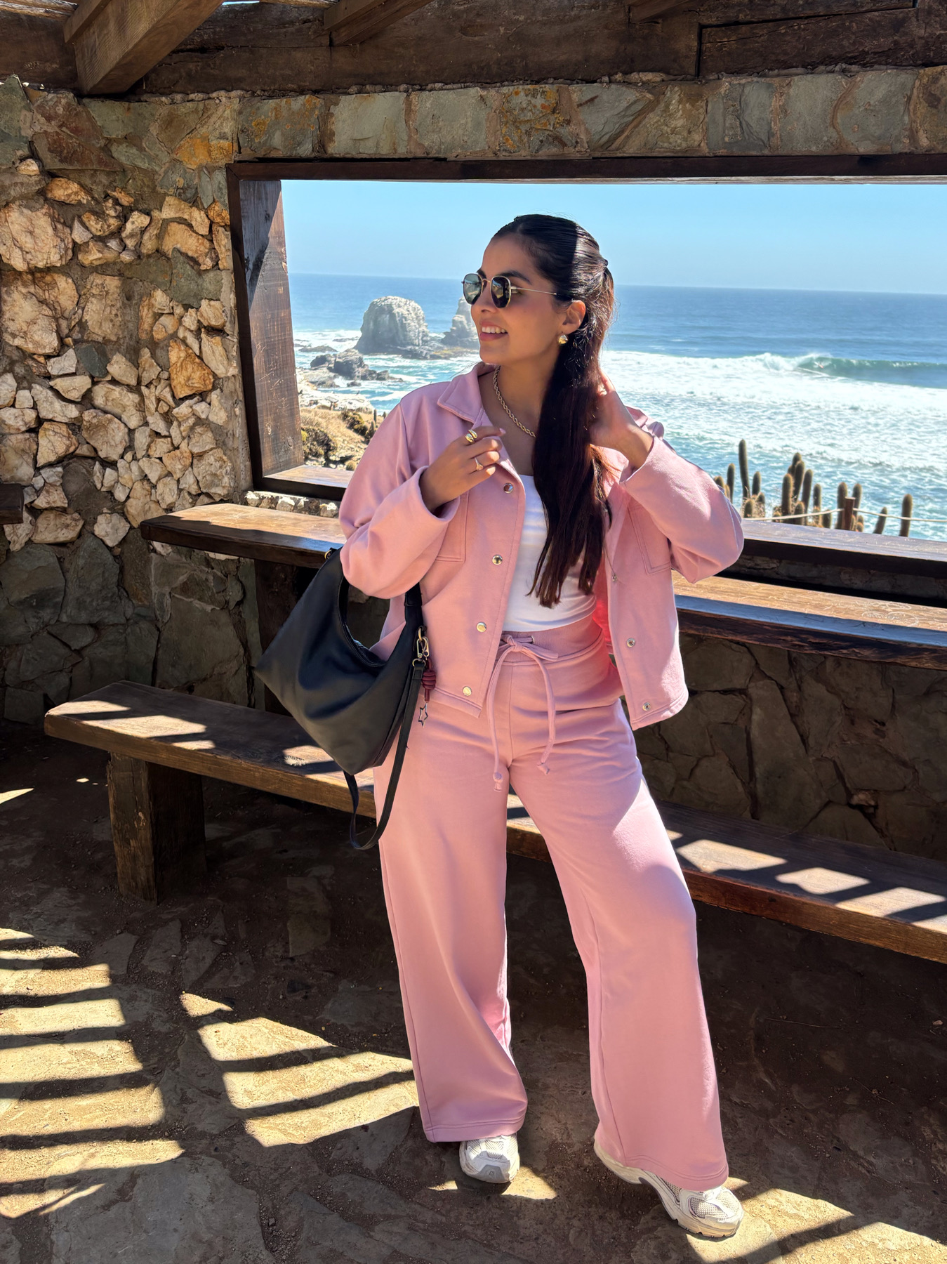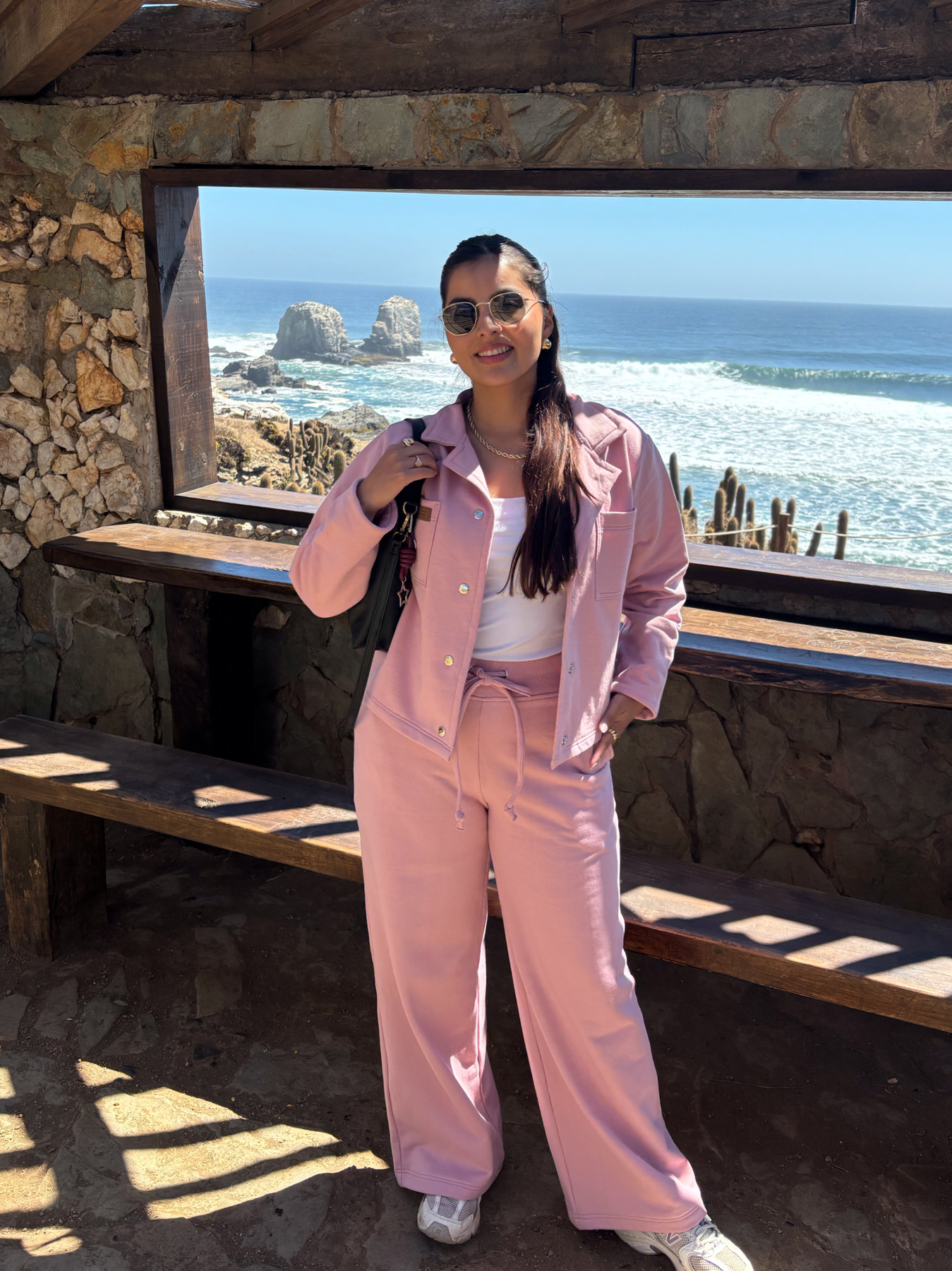 El Conjunto son 2 productos: un pantalón estilo palazzo con pretina y elástico, además de tira para un mejor ajuste. Y un polerón estilo chaqueta con broches y dos bolsillos.