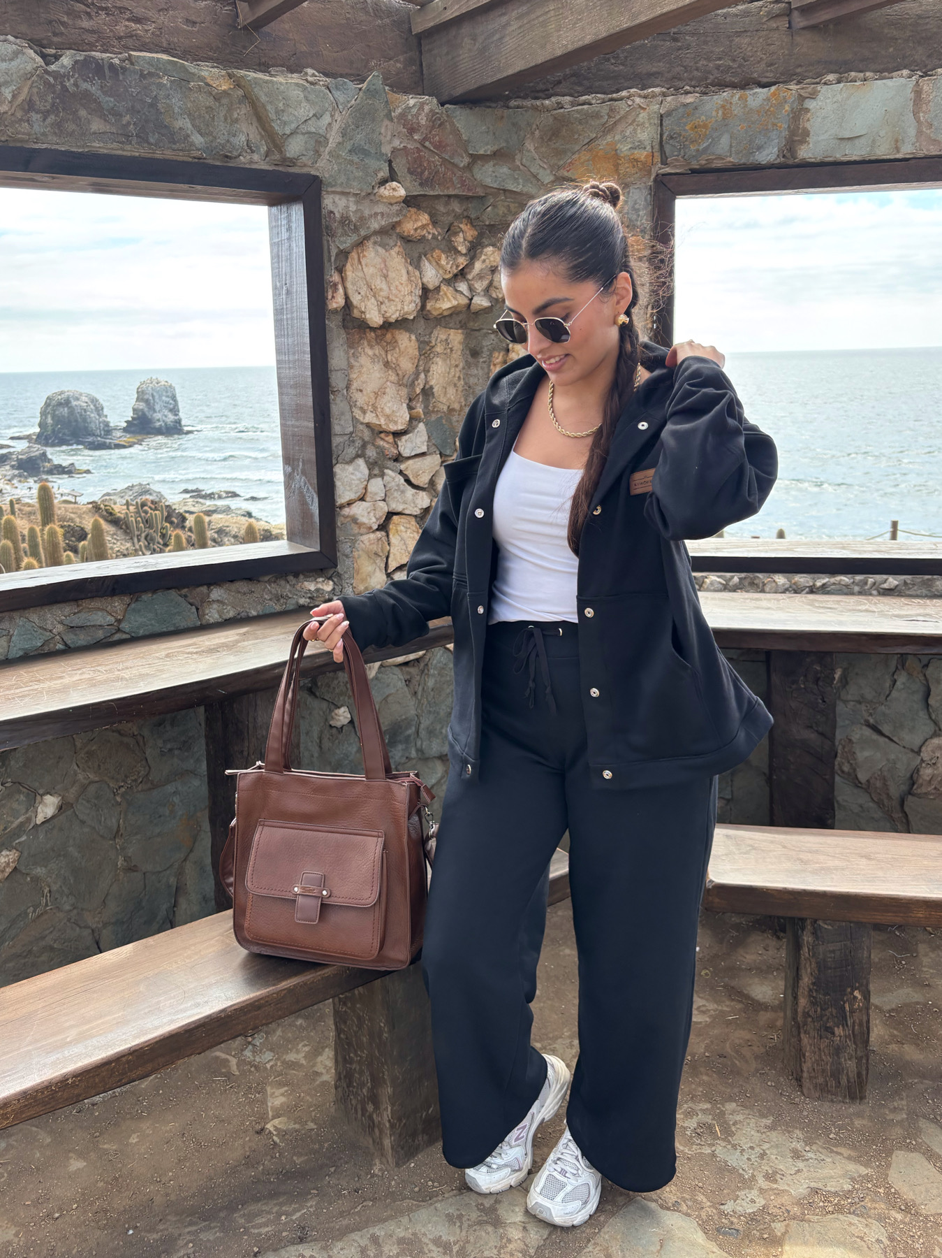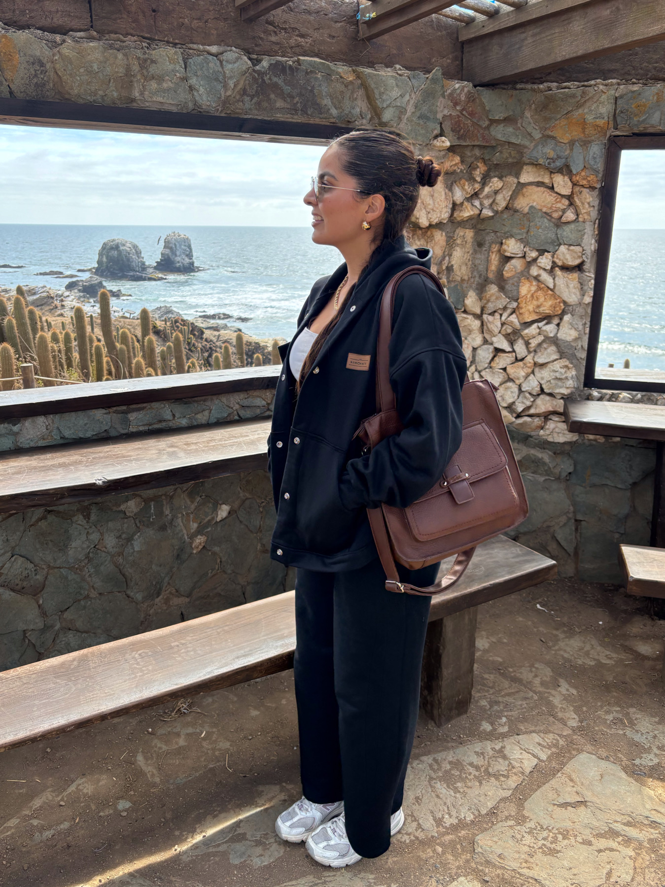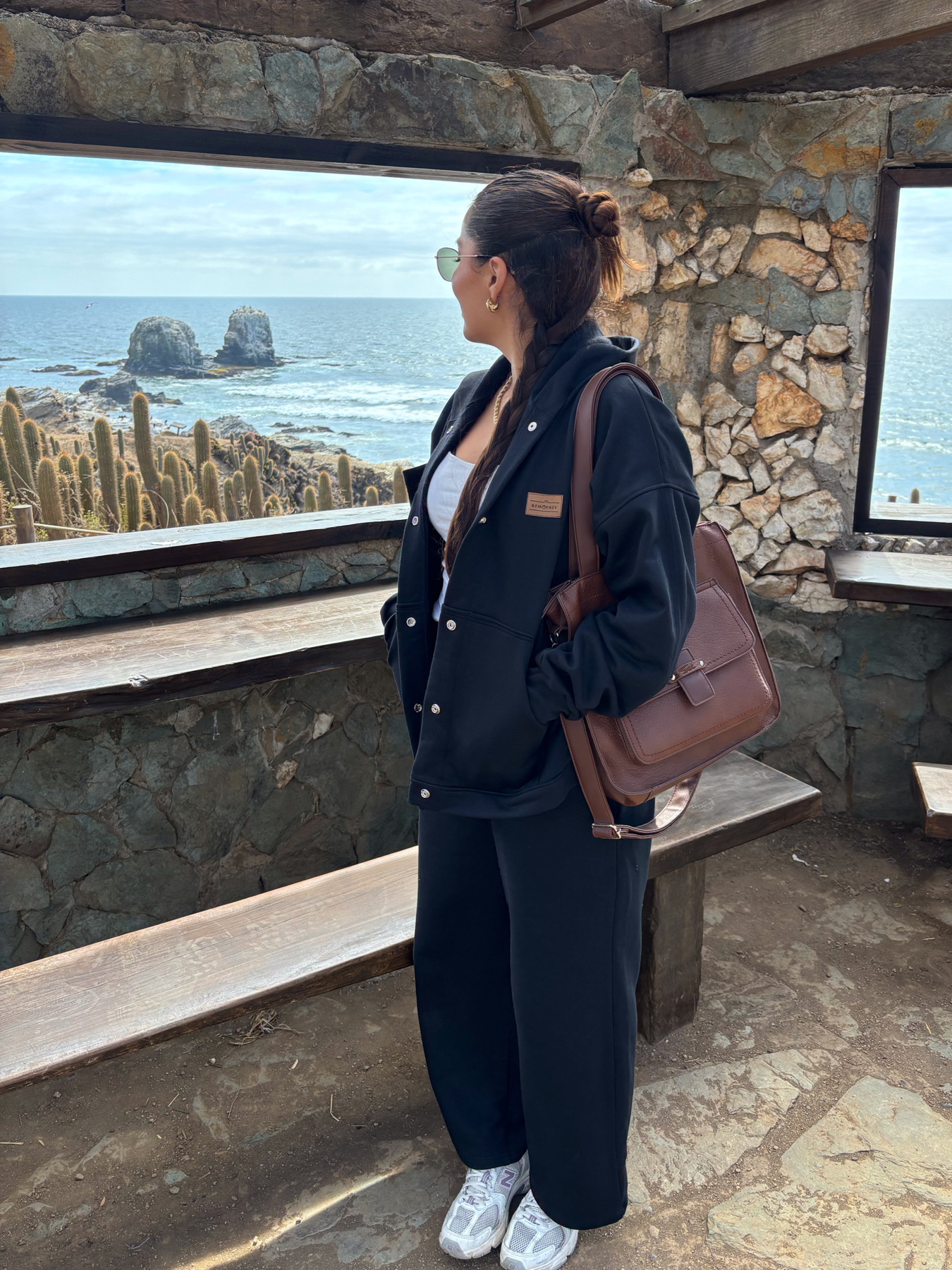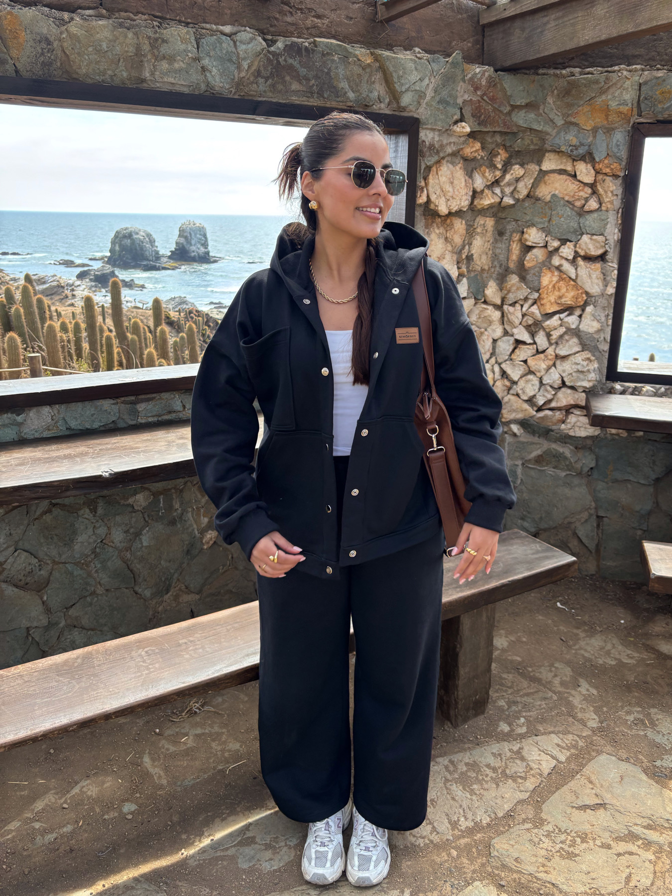 El polerón es con broches, gorro, 2 bolsillos inferiores y 1 bolsillo superior ideal para guardar el pasaporte en viajes. El pantalón es palazzo.
